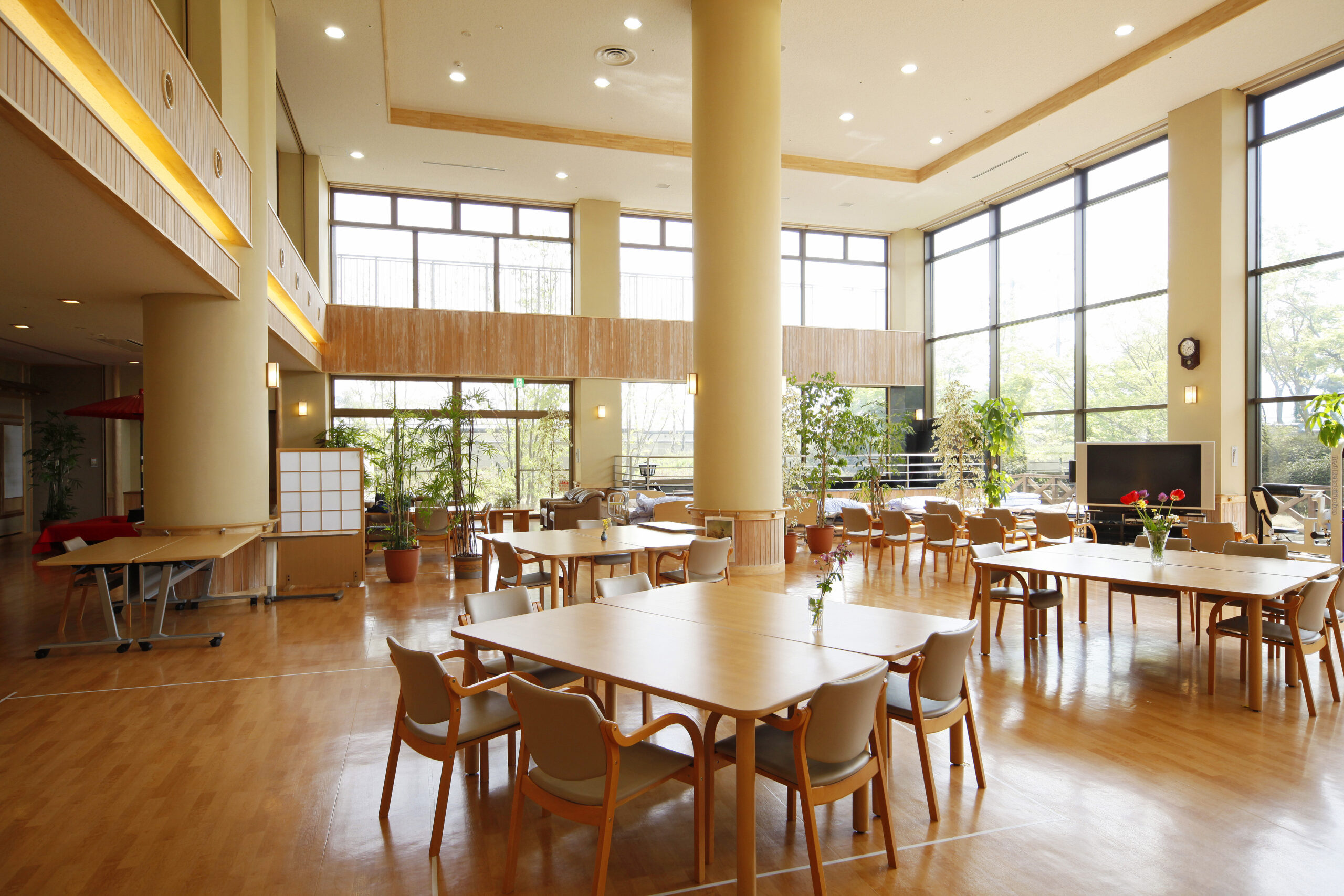 ・1階のデイケアスペースは天井の高い開放的な空間、茶室や暖炉が設置され、池では鯉を飼育。また、当スペースでは各種行事も執り行っており、地域の方々との交流の場としても活用。