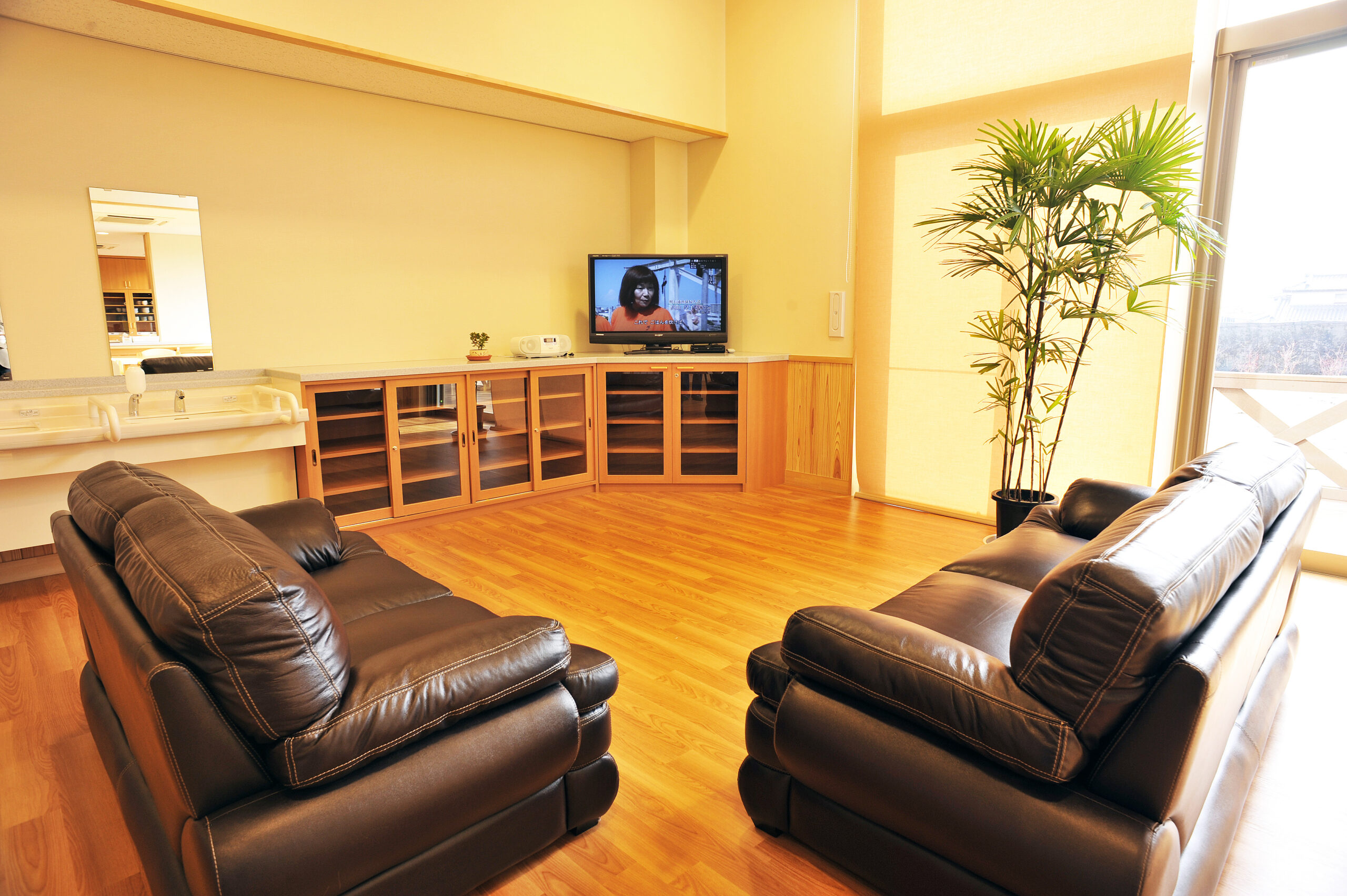 ・木のぬくもりに包まれた明るい食堂兼ホールにはゆったりくつろげるソファー、大型テレビを完備。また、ホールに面した入浴施設・ランドリーは家庭と同じ感覚でご利用いただけます。