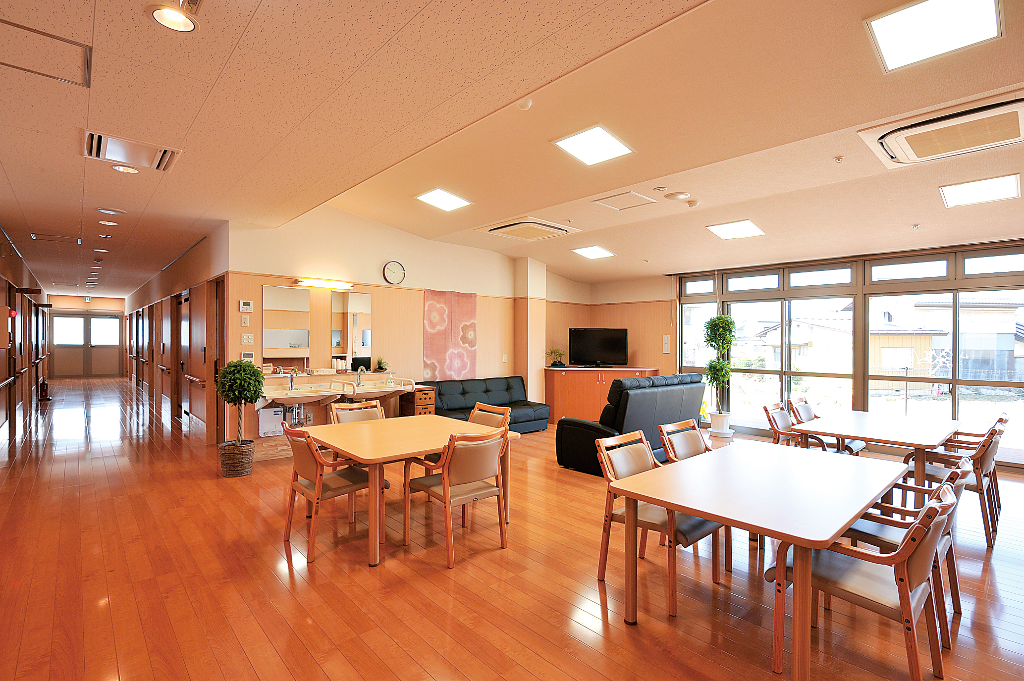 ・やさしく落ち着いた雰囲気の明るい食堂兼ホールにはゆったりくつろげるソファー、大型テレビを完備。また、ホールに面した入浴施設・ランドリーは家庭と同じ感覚でご利用いただけます。