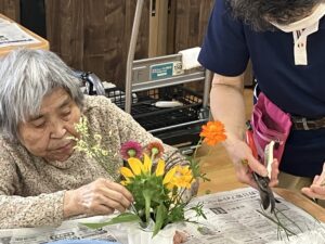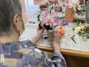 「フラワーアレンジメント」は季節の花を材料に毎年4月から11月まで月に2回開催し、参加される利用者様が思い思いに作品づくりを楽しまれ人気のあるイベントです。今日は男性の利用者さまも参加されていました。