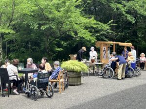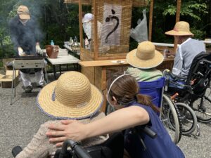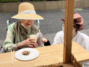 明日は土用の丑の日ということで、今日は午前中、玄関前にて「うなぎの炭火焼」を行い、多くの利用者様が集まり、昼食前の試食と冷たい飲み物で夏のひと時を過ごしていただいております。