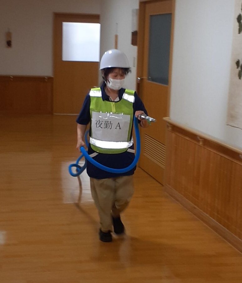 今回の訓練は「早朝の火災発生」を想定して行いました。夜勤職員と早番職員のみの限られた職員人数で、初期消火、避難誘導を行わなけ