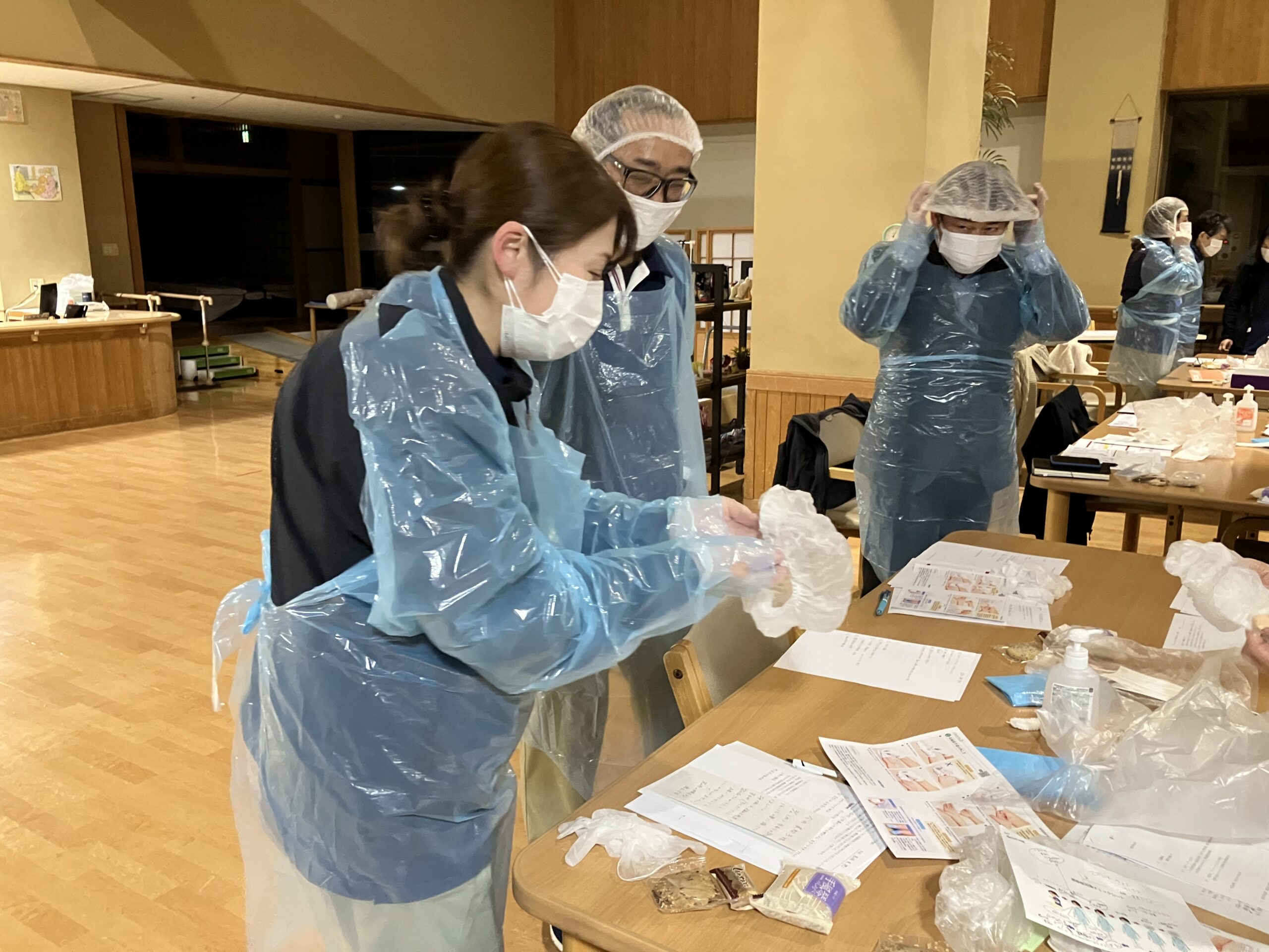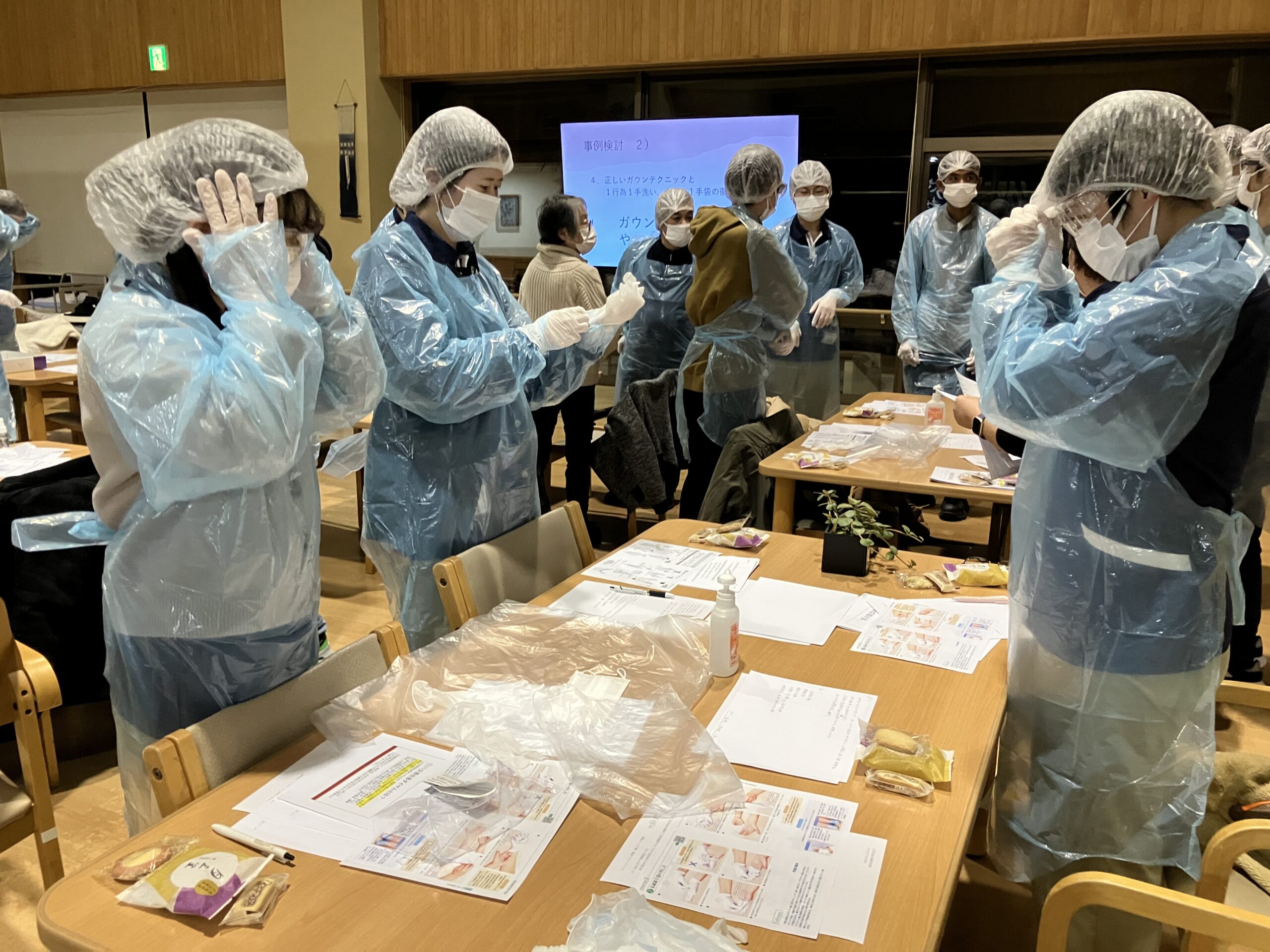 感染症シュミレーション研修では、正しいガウン・手袋の着脱方法、脱いだ後のガウンの捨て方についての実技研修を行いました。